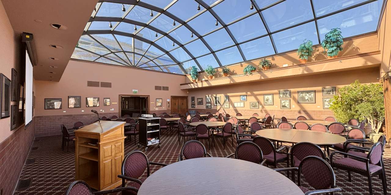 The dining room is a versatile, light-filled space designed to accommodate a wide range of events. Measuring 40 feet by 35 feet, the room comfortably seats up to 90 guests and accommodates 10 round tables including five large and five small tables. Six-foot rectangular tables are also available and are ideal for a buffet-style service. This space is well-suited for wedding receptions, family reunions, conferences, and similar gatherings. The room includes a podium and microphone, a drop-down projector screen measuring 60 inches by 80 inches and a projector for presentations. A vaulted glass ceiling enhances the atmosphere and makes the space equally appealing for daytime and evening events. Please note that the kitchen may only be used by our licensed catering partner, Sodexo.